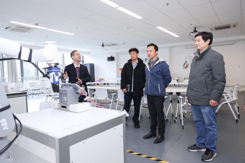 交流中,机器人现代产业学院相关负责人详细介绍了学校在机器人教育领域的探索实践,着重强调了培养学生创新思维与实践能力的重要性。邓奇分享了ABB 在全球机器人教育领域积累的丰富经验和取得的显著成果,阐述了ABB对机器人应用型人才培养的理解与长远规划。双方就深化产教融合、科研合作、技术攻关、行业资源共享、机器人STEM教育培训落地以及校企联合教材共建等议题,进行深入探讨,并达成共识。双方表示,未来继续整合各自优势资源,进一步完善STEM 教育培训体系,提升学生在机器人领域的综合素养,为行业输送更多高素质专业人才。