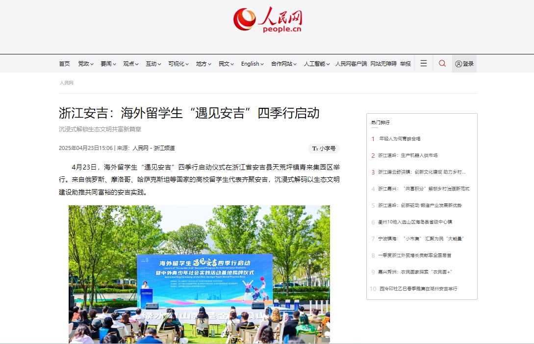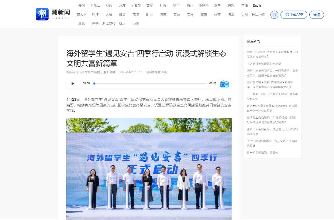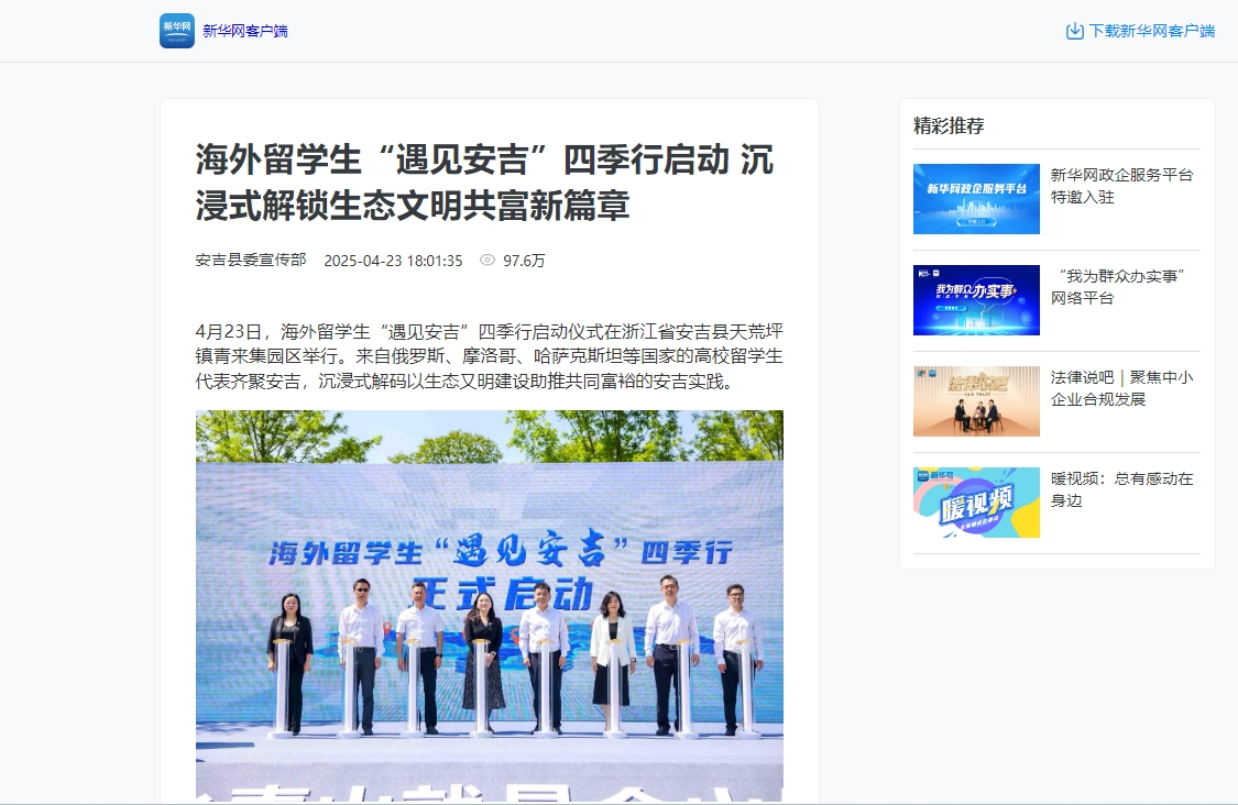 据悉,海外留学生“遇见安吉”四季行活动将围绕安吉四季主题体验、国际实践基地落地、青年入乡振兴乡村三个方面开展。启动仪式上,国家级中外青少年社会实践活动基地揭牌,安吉县委宣传部与bat365正版唯一官网、湖州师范学院签署国际传播战略合作协议,海外留学生受聘担任安吉乡村“国际观察员”,以多元形式向世界传递中国生态文明建设的生动实践。人民网、新华社客户端、潮新闻客户端(点击查看)等多家主流媒体报道了活动。