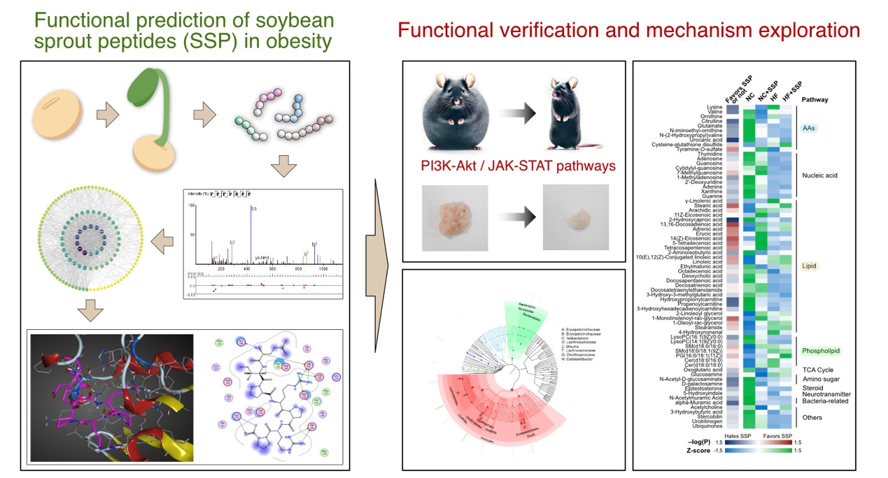 大豆萌芽肽(Soybean Sprout Peptides, SSP)作为萌发大豆的活性成分,在抗肥胖方面展现出显著潜力。本研究采用网络药理学、分子对接和体内实验相结合的综合方法,系统探索了SSP的作用机制。通过计算生物学与实验研究相结合,为SSP作为功能性食品或营养保健品用于预防和管理肥胖提供了重要的理论依据。本研究首次从系统机制层面对SSP的抗肥胖作用进行了深入探索,揭示了其通过调控多个代谢通路、靶向关键蛋白、干预肠道菌群及代谢产物的综合作用模式。研究不仅为SSP作为天然、低毒的抗肥胖功能因子提供了科学支持,也为未来开发以大豆芽肽为基础的功能食品和营养干预产品提供了理论依据和研究框架。