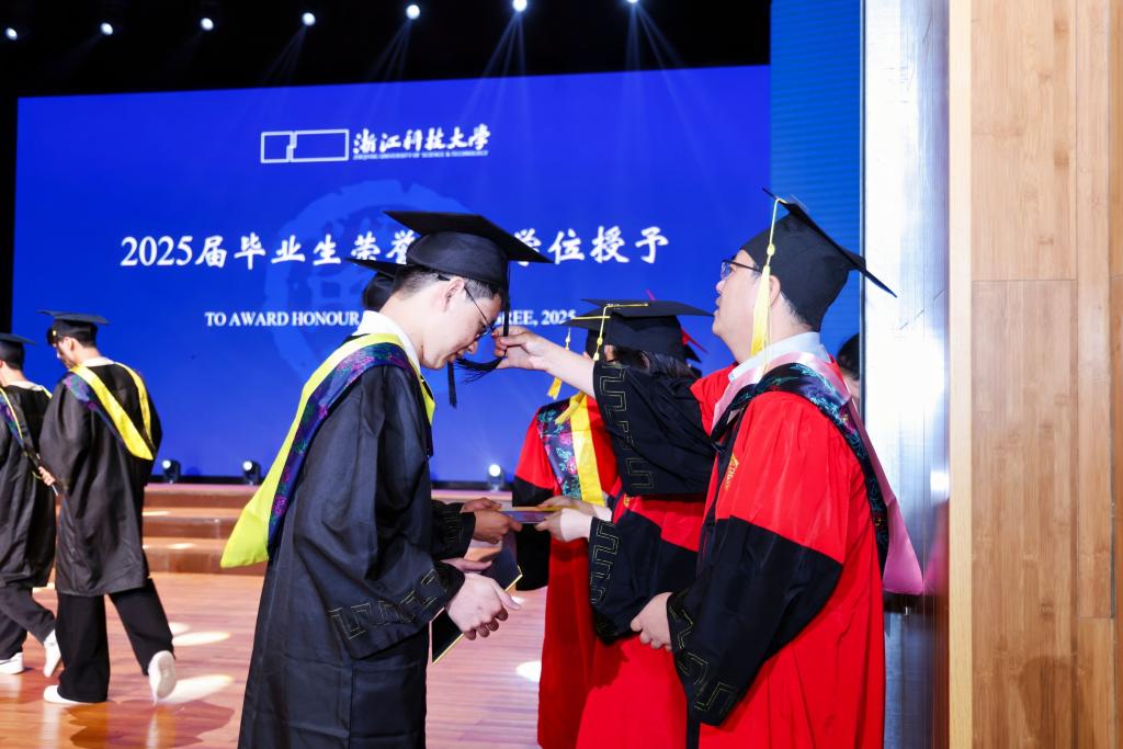 毕业典礼后,学士学位授予仪式举行。校学位委员会成员为本科毕业生授学位,一一拨穗正冠。