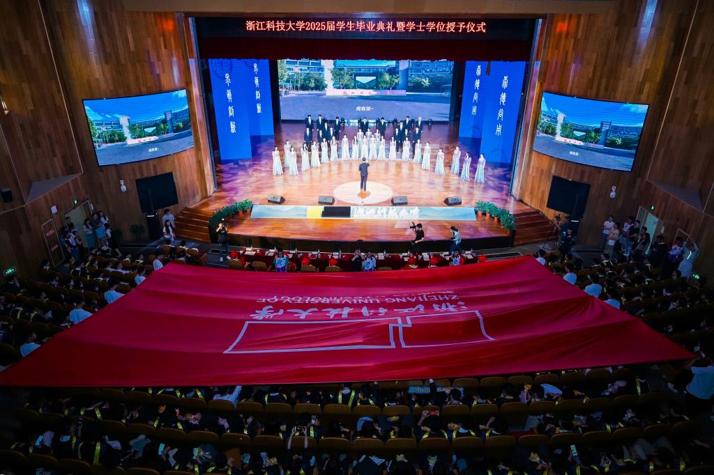 伴随着庄重昂扬的校歌,巨幅校旗从同学们头顶缓缓飘过,同学们共同托举校旗,向母校深情告白,表达传承弘扬“求实创新,自强不息,知难而进,矢志发展”浙科精神的信念与担当。