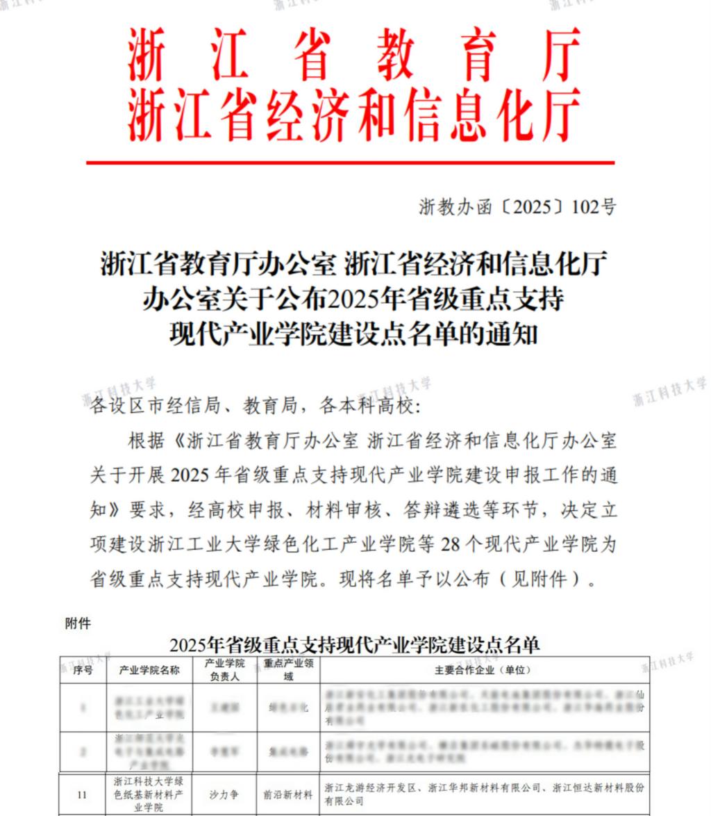 近日,浙江省教育厅办公室、浙江省经济和信息化厅办公室联合发布《关于公布2025年省级重点支持现代产业学院建设点名单的通知》,bat365绿色纸基新材料产业学院获批立项省级重点支持现代产业学院建设点。