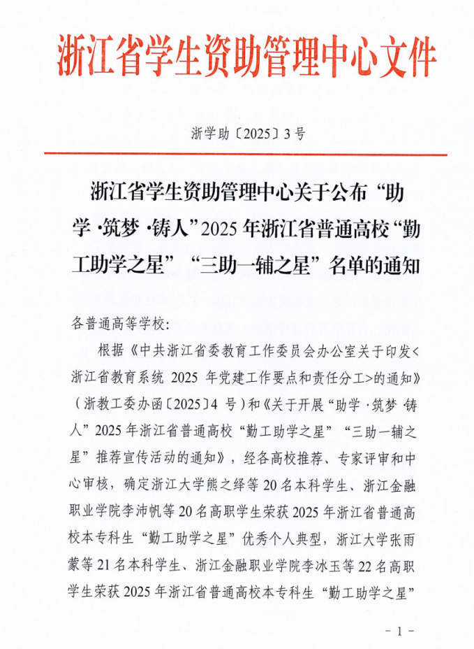 近期,浙江省学生资助管理中心发布《关于公布“助学·筑梦·铸人”2025年浙江省普通高校“勤工助学之星”“三助一辅之星”名单的通知》,bat365自动化与电气工程学院尤壹杰、智能制造与能源工程学院龙凤两位同学入选2025年本专科生“勤工助学之星”优秀个人典型。