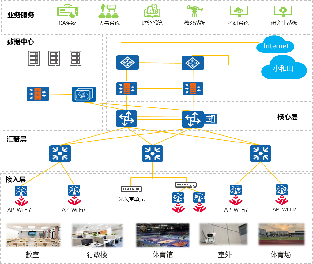 为充分满足学校事业发展对网络的需求,为广大师生提供更加稳定、流畅的用网体验,信息中心在暑期启动实施该项目。本次网络全面升级改造项目以“面向未来、体验优先、智能运维”为核心理念,构建了“全光网+Wi-Fi 7”双轮驱动的未来网络基座。校区有线网络采用全光骨干网络,支持万兆光纤到接入、双40G骨干到核心的架构设计,在重点区域实现光纤万兆入室,为智慧教室、科研实验室等场景提供极致网络体验。无线网络实现Wi-Fi 7全覆盖,消除图书馆、教学楼、实验室等关键区域的覆盖盲区,实现校区室内外无缝漫游,单AP上行配备2.5G端口,超高密度和室外AP上行更达10G端口,显著提升多用户并发能力与数据传输效率。全网采用国产自主可控设备,构建端到端安全防护体系,保障网络数据安全,并引入网络控制器与分析器,实现SDN自动化管理,支持智能运维,大幅提升运维效率与系统可靠性。
