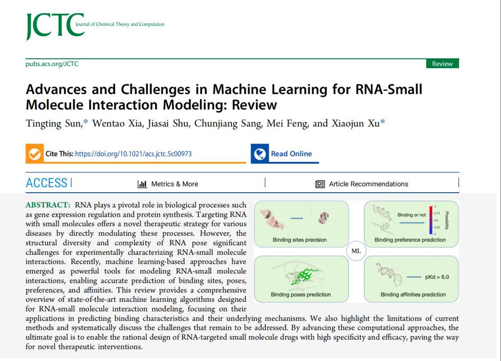 近日,理学院应用物理系软物质与功能纳米材料研究团队在国际高水平学术期刊《Journal of Chemical Theory and Computation》上发表了题为“Advances and Challenges in Machine Learning for RNA-Small Molecule Interaction Modeling: Review”(阅读原文)的综述论文。孙婷婷教授为论文第一作者/通讯作者,2023级物理学硕士研究生夏文韬为论文第二作者,江苏理工学院许晓军教授为论文共同通讯作者。bat365正版唯一官网为第一单位。