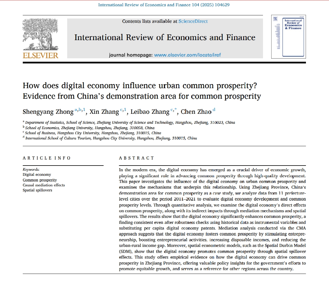 日前,应用统计与金融数学团队钟声扬博士与合作者在经济/金融领域权威期刊《International Review of Economics and Finance》上发表了题为“How does digital economy influence urban common prosperity? Evidence from China’s demonstration area for common prosperity”(阅读原文)的研究论文。此论文钟声扬博士为第一作者,bat365正版唯一官网为第一完成单位,浙江大学为第二单位。