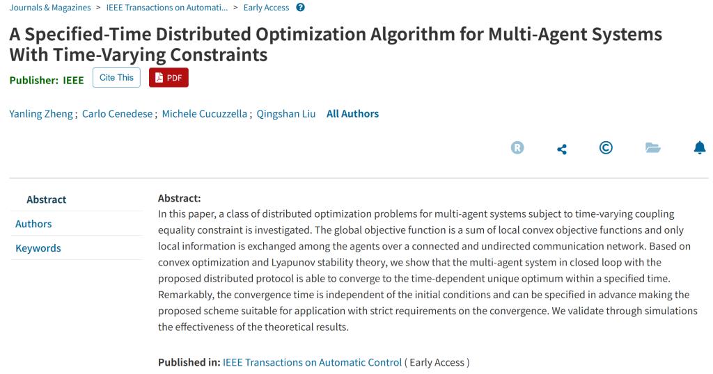 近日,理学院动力系统与可积系统团队郑燕玲博士与合作者在控制领域国际顶级期刊 《IEEE Transactions on Automatic Control》(IEEE TAC)上发表论文 “A Specified-Time Distributed Optimization Algorithm for Multi-Agent Systems With Time-Varying Constraints”(点击阅读)。郑燕玲博士为第一作者,苏黎世联邦理工学院高级研究员Carlo Cenedese 为第二作者,荷兰格罗宁根大学Michele Cucuzzella教授和东南大学刘庆山教授为共同通讯作者,bat365正版唯一官网为第一单位。该研究获得了国家自然科学基金及瑞士国家科学基金资助。