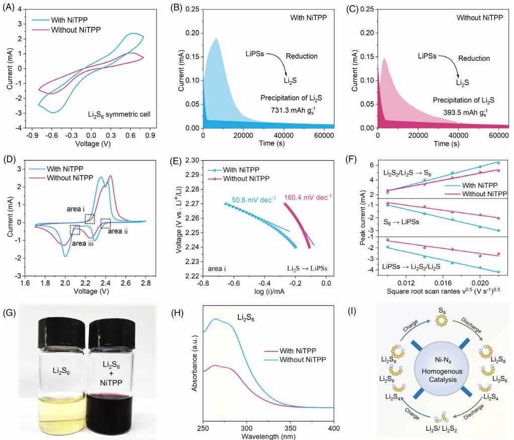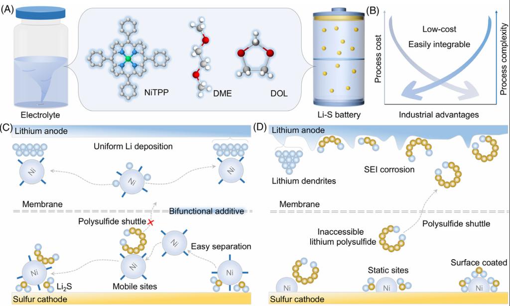 本研究创新性地将镍(II)四苯基卟啉(NiTPP)引入锂硫电池电解液中,借助其独特的结构特性与催化活性,实现对正、负极问题的协同调控。NiTPP分子具备大共轭氮结构和高亲锂性,其平面构型可在锂金属表面动态铺展,形成致密分子层,从而引导锂离子均匀沉积,抑制枝晶生成与副反应发生。同时,分子中心的Ni–N₄结构作为高效催化位点,显著促进了多硫化物的转化反应动力学,并展现出优异的抗钝化能力。该电解液添加剂策略同步缓解了正极穿梭与负极枝晶两大瓶颈,为高性能锂硫电池的开发提供了具有规模化潜力的技术路径,彰显了分子工程在推动下一代高能量密度电池发展中的关键作用。