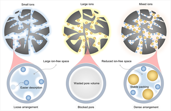 超级电容在面向电网储能及电动汽车等重要应用时,其固有的能量密度不足仍是制约规模化部署的核心瓶颈。本研究创新性地提出了异尺寸离子协同策略:通过精准匹配大小阴离子,使其在分级碳孔结构的微孔区域内形成动态适配,借助致密离子填充有效压缩自由体积。这种限域环境显著抑制了离子自由度,从而强化了电极界面的吸附稳定性。所构建的异尺寸离子-孔结构匹配体系,不仅实现了能量密度的显著提升与自放电动力学的有效抑制,更在宽温范围(-20℃至80℃)内展现出优异的电容保持性能,为极端温度条件下实现高稳定储能开辟了新的电解质设计路径。理论模拟与系统电化学测试共同证实,该策略能够有效适配商业活性炭电极孔结构,在提升能量密度与系统稳定性方面具有重要应用前景。