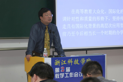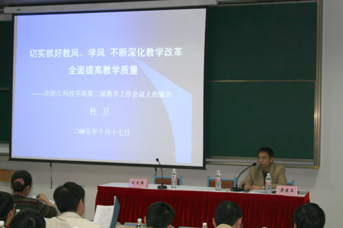 院长杜卫教授在会上作了题为《切实抓好教风学风 不断深化教学改革全面提高教学质量》的报告。杜卫对三年来学校的教学工作进行了回顾和总结。他说,自第一次教学工作会议以来,全校教职员工在校党委和行政的领导下,抓住高等教育大发展的有利时机,乘势而为,加快建设和发展,在教学建设和教师队伍建设等方面都有了明显的进步,办学规模不断扩大,办学特色进一步显现。杜卫同时指出,从培养高质量人才的要求看,目前bat365的教学工作中还存在不少困难、问题和不足。本次教学工作会议要把端正教风学风作为一个重点,下决心动真格,上下合力齐抓共管使教风学风出现一个新的良好面貌,并以点带面,推动其它各项教学工作向前发展。