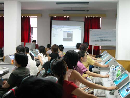 这次培训分三块内容,一是多媒体CAI课件素材的获取与制作,二是Powerpoint2002演示型课件制作实例,三是Authorware6.0专业型课件制作实例,参加培训人员可根据自己的需要任意选择。教育信息技术学派出了雷运发、莫云峰、孙晓勇三位老师担任主讲,参加培训的教师普遍感到收获很大。近70位教师参加了本次培训。