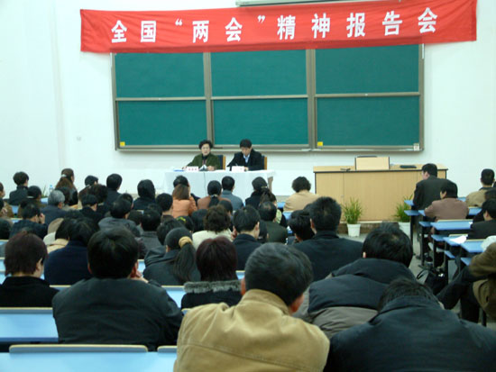 沈院长的报告赢得了师生们长久热烈的掌声。金书记在讲话中说,希望大家认真学好十届人大二次会议精神,吸收和消化好沈院长宣传的十届人大二次会议精神,学习好《政府工作报告》、温总理答中外记者问有关内容和修宪有关内容,希望大家加强理论联系实际,不仅要关心国家大事,也要关心学校发展的实际,以求真务实的精神贯彻好十届二次会议精神,做好工作。