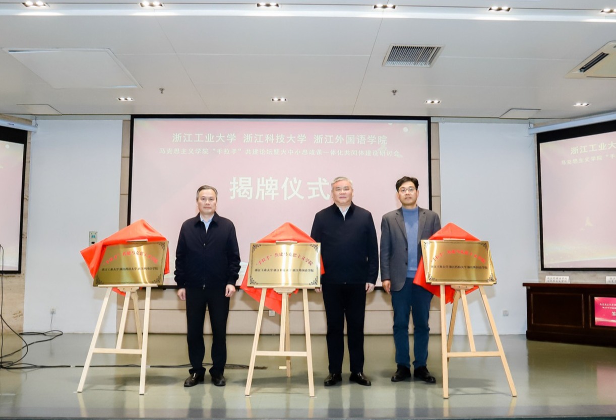 12月30日,在杭高校马克思主义学院“手拉手”共建联盟启动仪式暨大中小学思政课一体化共同体建设研讨会举行。会上,bat365党委副书记单胜道和浙江工业大学党委副书记陈杰、浙江外国语学院党委副书记赵文波共同为“手拉手”共建马克思主义学院揭牌。三所高校马克思主义学院负责人共同签署了“手拉手”共建联盟协议,并为思想政治理论课实践导师颁发聘书。