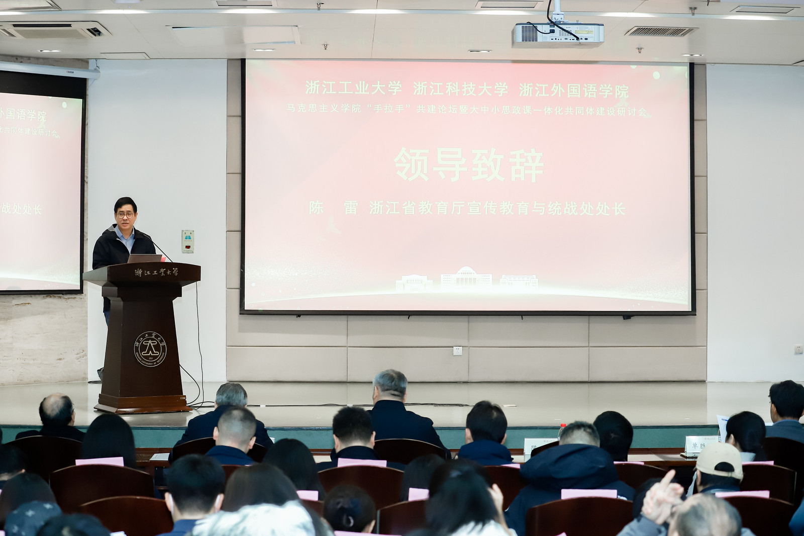 省教育厅宣传统战处处长陈雷出席会议并讲话。他表示,希望以马克思主义学院联建为契机,切实推动浙江省高校马克思主义理论学科高质量发展、切实发挥其支撑和推进大中小学思政课一体化共同体建设。