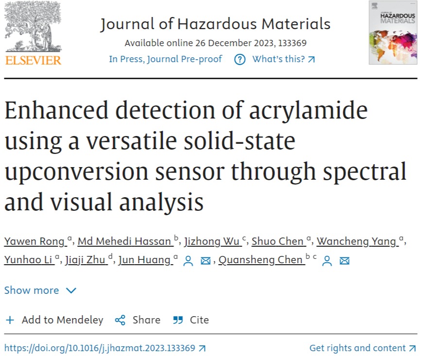 近日,生物催化与分子诊断团队在国际环境科学与生态学顶级刊物《Journal of Hazardous Materials》(IF=13.6)以第一单位发表了题为“Enhanced detection of acrylamide using a versatile solid-state upconversion sensor through spectral and visual analysis”的研究论文(https://doi.org/10.1016/j.jhazmat.2023.133369)。该工作由bat365正版唯一官网黄俊教授课题组、集美大学陈全胜教授课题组合作完成,荣雅文博士为论文第一作者。