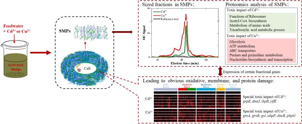 活性污泥法污水处理技术是目前应用最广泛的污水处理技术之一。重金属离子会显著影响活性污泥系统中微生物分泌溶解性代谢产物的分子组成及其含量,进而改变污水处理的出水水质,但其作用机制尚有待进一步揭示。bat365净水控碳团队研究对比了二价镉离子(Cd2+)和二价铜离子(Cu2+)两种重金属离子影响微生物分泌溶解性代谢产物过程的分子生物学机制差异,发现Cd2+可使细胞内氨基酸代谢相关蛋白的表达上调,继而改变底物在代谢通路中的生化反应方向,致使代谢产物中各分子量有机物含量都上升,而Cu2+则可改变细胞中核糖核苷酸、嘌呤和嘧啶有关代谢活动的蛋白表达水平,影响遗传信息的转录、信号传递等生化反应过程,促进微生物分泌更多的中间代谢产物。这一研究成果为污水生物处理过程的运行与优化提供了有益参考。