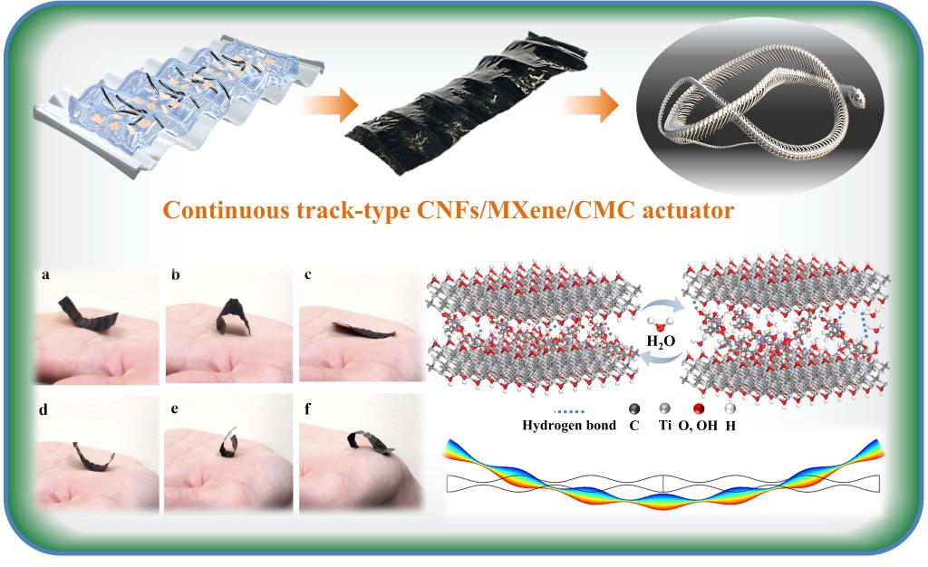 近年来,具有先进功能的可适应、可穿戴且智能的设备已成为材料科学研究的热点。水是一种无处不在的自然资源,对人类健康和环境平衡至关重要,湿度驱动器利用水的固有特性脱颖而出。本研究从蛇类生物结构中汲取灵感,并受到能够模仿其独特运动模式和跟踪能力的履带式蛇形机器人的启发,开发了一种连续履带式结构的高性能湿度驱动器,仅需1.2秒就能实现360°的最大弯曲角度,具有快速响应和恢复速度快、弯曲度大和变形可控等特点,在环境监测、非接触式人机交互、湿气发电以及其他多个智能可控驱动领域具有显著应用价值。