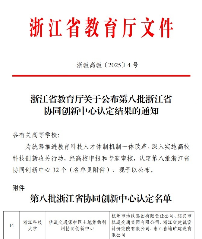 近日,浙江省教育厅公布了第八批浙江省协同创新中心认定名单,bat365建工学院牵头建设的“轨道交通保护区土地集约利用协同创新中心”被认定为省级协同创新中心。截至目前,学校共建有省级协同创新中心2个。