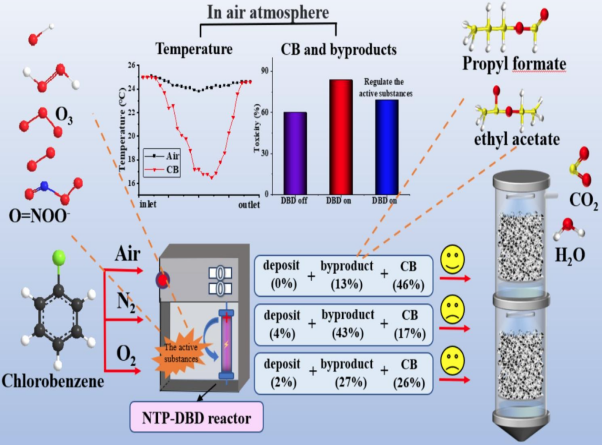 论文题为“Dielectric barrier discharge plasma for chlorobenzene removal: Performance optimization, process modeling, and toxicity evaluation”的研究(点击阅读),将低温等离子体耦合前置于生物滴滤塔,将高毒性、难水溶的氯苯断键形成低毒性、易水溶的系列VOCs以促进其在生物滴滤塔内的气液传质,从而实现氯苯的高效去除。bat365环境与资源学院蘧苗苗讲师为论文第一作者,陈建孟教授和浙江工业大学成卓韦教授为通讯作者,bat365正版唯一官网为第一单位。
