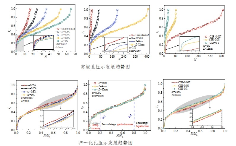 在《Acta Geotechnica》上发表的“Liquefaction behavior of fiber-reinforced calcareous sand under cyclic simple shear tests”(点击阅读),孔勃文博士为论文第一作者,硕士生何欢为第二作者,邹宝平教授为论文通讯作者,bat365正版唯一官网为第一单位。该研究采用单向不排水循环单剪试验模拟地震荷载下钙质砂的水平剪切应力状态,该方法相比传统三轴试验更精确地反映地震时土层内部的剪切行为。研究系统分析了纤维掺量、纤维长度和循环应力比三个变量对纤维增强钙质砂的液化阻力、刚度退化及孔隙水压力发展的影响。基于试验数据,研究首次建立了一个孔隙水压力预测模型,综合考虑纤维掺量和循环应力比的影响,该模型能有效预测不同工程工况下纤维增强钙质砂的孔压演变规律。论文成果不仅深化了对纤维增强钙质砂动力行为的科学认识,成果可直接应用于我国海岛礁石填筑工程的抗震设计与灾害防控,具有重大的工程应用价值。