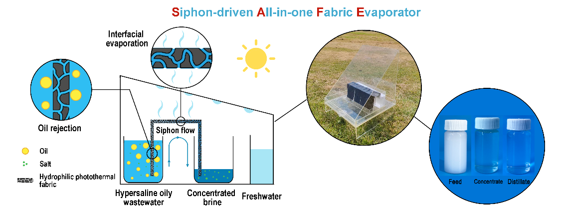 团队在胶体与界面科学领域高水平期刊Journal of Colloid and Interface Science上在线发表了题为“Siphon-driven all-in-one fabric evaporators for multi-purpose treatment of hypersaline oily wastewater”的论文(点击阅读),2023级硕士研究生李响为该论文第一作者,黄俊教授、邓然博士与浙江大学杨皓程研究员为论文通讯作者。bat365正版唯一官网为第一单位。工业高盐含油废水因其成分复杂、处理难度大,一直是环境治理领域的一大难题。传统处理技术,如反渗透、膜蒸馏等,常面临膜污染以及盐分回收困难等瓶颈。生物催化与分子诊断研究团队创新性地开发出一种耦合单向虹吸流动与太阳能驱动蒸发的一体化纤维蒸发器(SAFE),巧妙集成截留、蒸发与浓缩过程,实现了高盐含油废水中油、水与盐的高效分离与资源化回收,为工业废水处理提供了极具潜力的创新解决方案。本研究通过贻贝仿生沉积技术,制备出兼具优异亲水疏油特性和高效光热转换能力的亲水光热纤维膜。纤维膜利用其优异的亲水性实现对油滴的有效截留,并通过虹吸效应实现盐溶液在纤维内的自发、定向传输。在太阳光驱动下,水分快速蒸发并经冷凝后回收得到清洁淡水。与此同时,浓缩后的盐水在纤维出口端被及时导出,此设计有效抑制了盐分结晶对蒸发过程的阻碍问题,进而实现了高效、持续的蒸发性能。实验结果表明,SAFE系统展现出卓越的蒸发效率和油水分离能力。在一个太阳光照下,SAFE蒸发速率可达2.19 kg·m-2h-1,盐分浓缩1.57倍,油水分离效率突破99.8%,户外实验也进一步证实了其优异的抗污性和长期稳定性。
