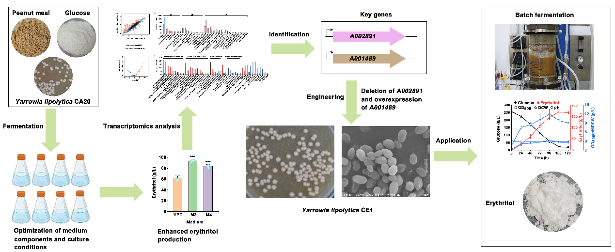 团队在生物资源领域权威期刊Bioresource Technology在线发表题为“Metabolic engineering combined with fermentation optimization enables sustainable production of erythritol by Yarrowia lipolytica from peanut meal and glucose”(点击阅读)的论文。2022级硕士研究生陈雨晴为论文第一作者,黄俊教授和夏凯博士为论文通讯作者,bat365正版唯一官网为第一单位。近年来,天然甜味剂赤藓糖醇凭借肠道耐受性好、低热值和不改变血糖浓度等特性而受到食品及医药行业的广泛关注,市场需求量快速上升。目前,赤藓糖醇主要由解脂亚罗酵母(Yarrowia lipolytica)以葡萄糖为底物进行高渗发酵制备,生产成本较高。为降低生产成本,研究团队成功创制了利用花生粕和葡萄糖发酵合成赤藓糖醇的方法。通过发酵条件优化和代谢工程改造,实现废弃物花生粕的高价值利用。此外,研究揭示了解脂亚罗酵母适应花生粕培养基的分子机制,成功挖掘关键基因A001489和A002891。研究结果为定向选育高产菌株和提高赤藓糖醇发酵水平提供了新思路。