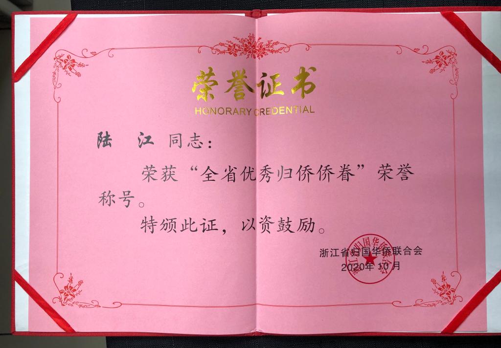 近日,浙江省第十次归侨侨眷代表大会在杭州召开,会议对全省侨界“十杰”及提名奖、先进集体、先进工作者和优秀归侨侨眷进行了表彰。bat365留联会副会长陆江博士荣获“全省优秀归侨侨眷”荣誉称号。