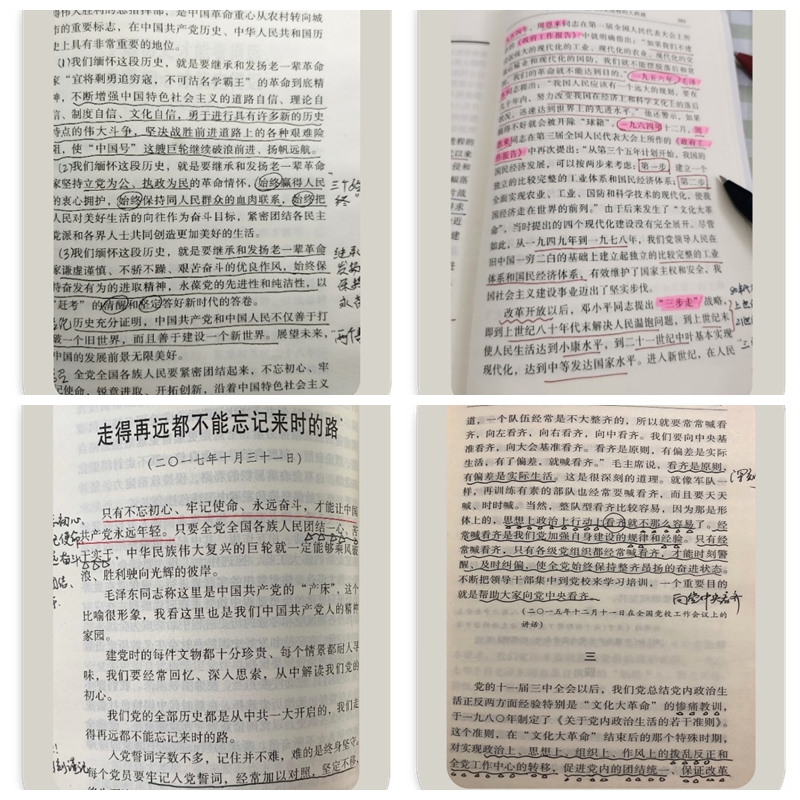 在学习文稿《走得再远都不能忘记来时的路》中,陈巧老师写下“不忘初心,牢记使命,永远奋斗”的心得。方奕老师在文稿《中华民族伟大复兴历史进程的大跨越》中圈划出重要的时间节点。施益萍老师在学习《总结党的历史经验,牢固树立“四个意识”》论述中,标记了党的历史经验和“四个意识”内容。在学习文稿《以“赶考”的清醒和坚定答好新时代的答卷》中,黄扬老师写下“三个始终”、“两个善于”等总结。支部党员们都认真学习,深入体会并记录自己的心得。