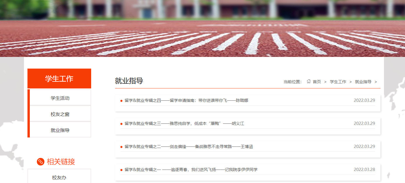 当前正值2022届毕业生求职择业冲刺时期,外国语学院在学院网站专栏开设就业指导专栏(链接:http://wyx.zust.edu.cn/xsgz/jyzd.htm) ,邀请2022届级同学向低年级的学弟学妹们介绍读研准备、出国留学规划等多方面的经验,帮助学弟学妹们更好地规划自己的大学生活,并设定更符合自身的目标。