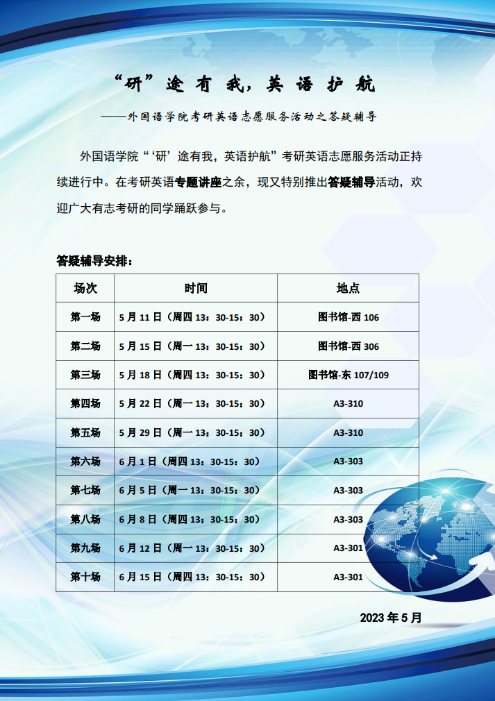 据悉,考研英语答疑辅导服务活动是外国语学院想学生之所想、响应呼声所推出的又一助考举措,是学院教师积极践行“我为师生办实事”又一生动体现,作为正在持续开展的考研英语专题讲座的有益补充,二者共同构成学院“‘研’途有我,英语护航”考研英语志愿服务活动的主要形式,本轮答疑辅导服务活动将在图书馆考研自习室、外国语学院考研辅导室等场所轮流举行(详见下表),方便备考学生前来咨询交流。希望通过答疑辅导提高bat365考生的英语成绩,助力更多学生考研圆梦。(外国语学院 石教旺)