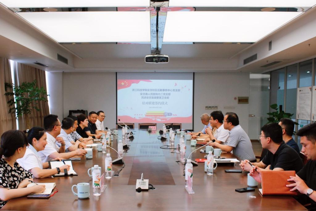 6月15日,安吉校区后勤事务中心党支部与安吉县人民医院内二党支部举行结对共建签约仪式,两支部与民进安吉基层委医卫支部开展联学活动。