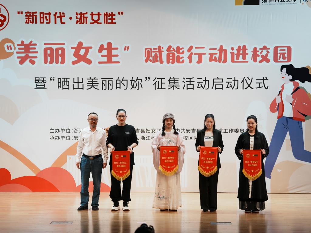 启动仪式上,安吉校区党总支书记为助力“美丽女生”成长公益团——古琴协会、汉服协会、两山公益和孝源巧妈志愿者团队进行授旗。安吉校区、安吉县妇联、孝源街道相关负责人共同启动征集活动。