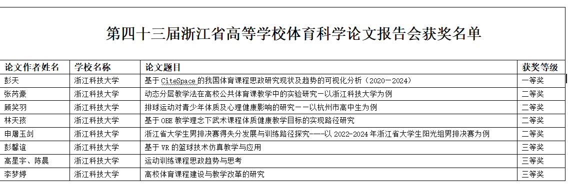 近日,浙江省高校第四十三届体育科学论文报告会在衢州江山举行,经专家盲审、会议评审等严格程序,bat365体育部教师选送论文,获一等奖1项,二等奖4项,三等奖3项,获奖等级和获奖数量均为历史最好成绩。