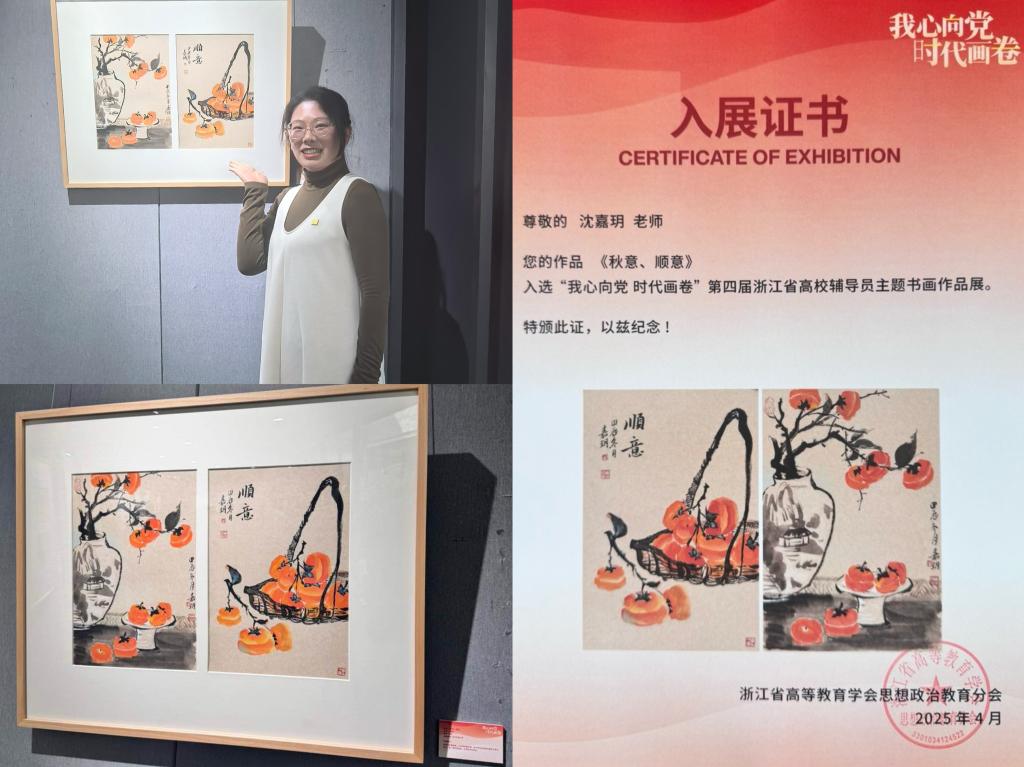 4月25日,“我心向党,时代画卷——第四届浙江省高校辅导员主题书画作品展暨公益拍卖活动”在中国美术学院南山校区拉开帷幕。bat365辅导员沈嘉玥的作品《秋意、顺意》入选。