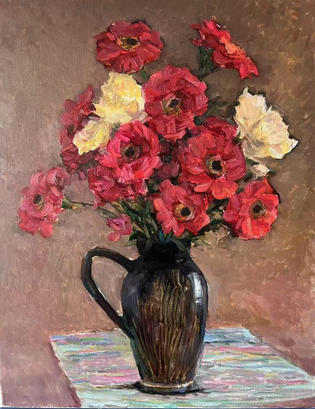 该作品由离退休处特邀监察员王雪梅老师创作,其主题立意是通过蓬勃绽放的花朵体现顽强的生命力和对春天的礼赞,鲜艳的红色象征着在中华民族伟大复兴的征程中永续传承的“红色基因”和迎难而上、坚韧不拔的革命精神。整幅作品体现了我们在新征程上意气风发、毅然前行的坚定信心和必胜决心。