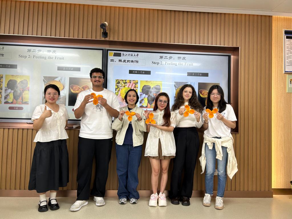 活动现场,国际中文教育24级研究生胡敏华向大家展示了不同年份的陈皮,介绍了陈皮的定义、产地、中药功效等,重点介绍了新会陈皮的基本情况,她从选果、开皮、翻皮、晾晒等关键环节逐一阐述其制作操作要点。现场中外师生一起体验“开皮”和“翻皮”,大家在合作中成功跨越了语言与文化的障碍,让陈皮制作技艺这一传统文化瑰宝,成为连接不同文化交流的纽带。现场大家还一起品鉴了陈皮糖、陈皮果脯、陈皮茶,认识陈皮在现代生活中的多元应用。