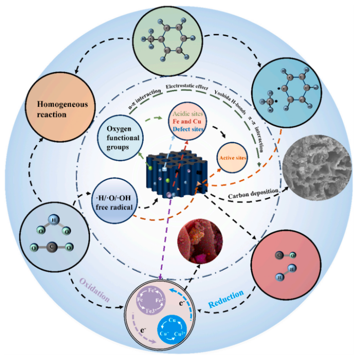 在Journal of Environmental Chemical Engineering上发表的“Efficient hydrogen conversion of toluene via biochar-supported Fe-Cu bimetallic catalyst under CO2-steam synergistic conditions”(点击阅读),硕士研究生张健凯为第一作者,叶超副教授为通讯作者,bat365正版唯一官网为第一单位。研究结果表明,Fe-Cu双金属的协同效应增强了催化剂金属位点的抗氧化性,降低了反应的活化能,并提高了对碳沉积的抵抗力。该研究为双金属催化剂对甲苯高效氢转化提供了理论基础。