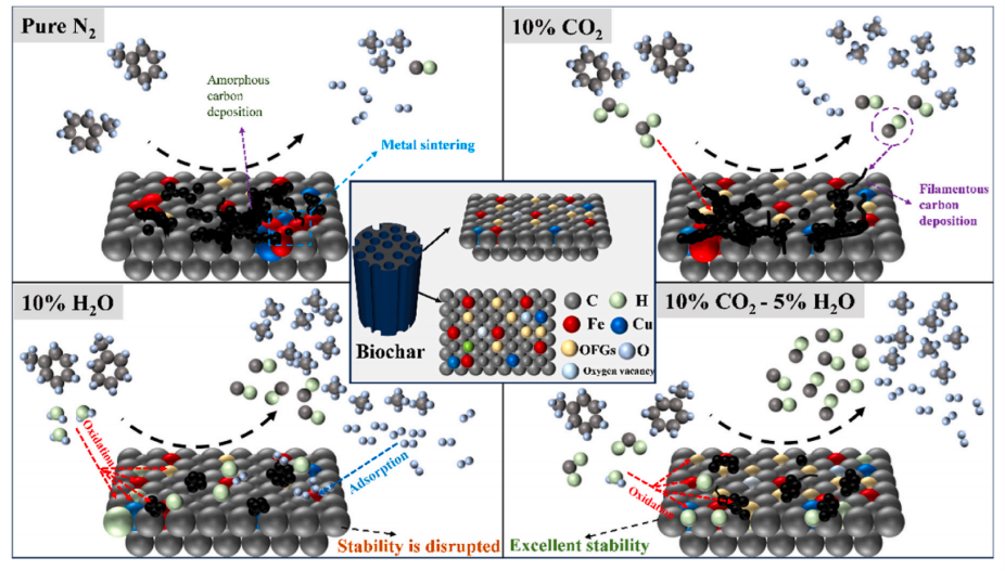 在Journal of the Energy Institute上发表的“ CO2-H2O Synergy Enables Stable Tar Model Compound Reforming over Fe–Cu Biochar Catalyst for Clean Hydrogen Production” (点击阅读),硕士研究生张健凯为第一作者,叶超副教授为通讯作者,bat365正版唯一官网为第一单位。研究结果表明,10%CO2-5%H2O混合气氛能够有效抑制碳沉积,缓解金属颗粒烧结,防止过度氧化诱导的失活,并协同稳定催化剂表面的含氧官能团。该研究为开发高度稳定的生物质气化系统提供了可行的途径和理论基础。