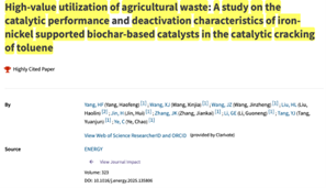 在Energy上发表的“High-value utilization of agricultural waste: A study on the catalytic performance and deactivation characteristics of iron-nickel supported biochar-based catalysts in the catalytic cracking of toluene” (点击阅读),硕士研究生杨豪锋为第一作者,叶超副教授为通讯作者,bat365正版唯一官网为第一单位。该论文同时入选2025年11月ESI高被引论文。研究结果表明,Fe-Ni催化剂实现了54.01%的最高效率,最大的微孔面积为9.95 m2/g,最低的碳沉积率为3.15%,为生物炭基催化剂的失活机理提供理论支持。