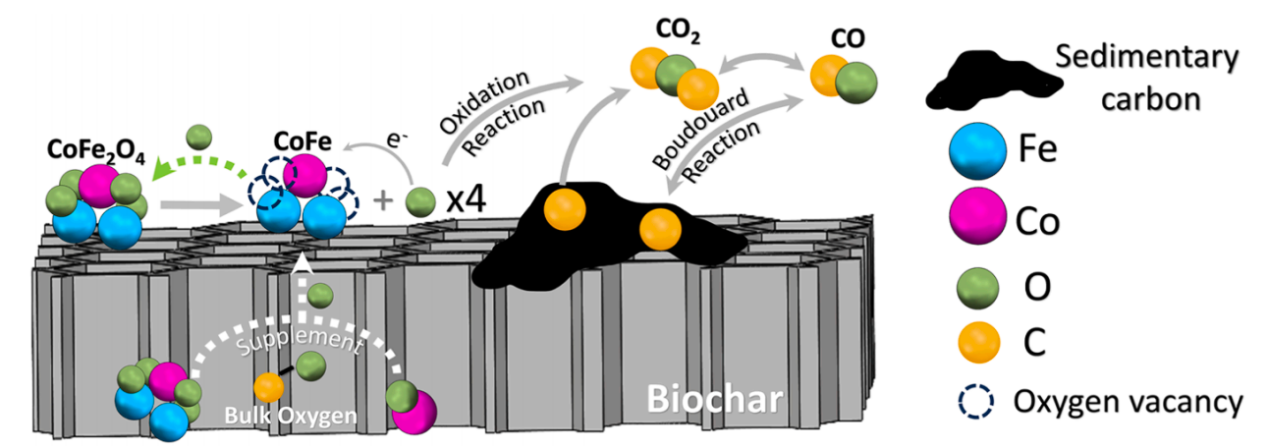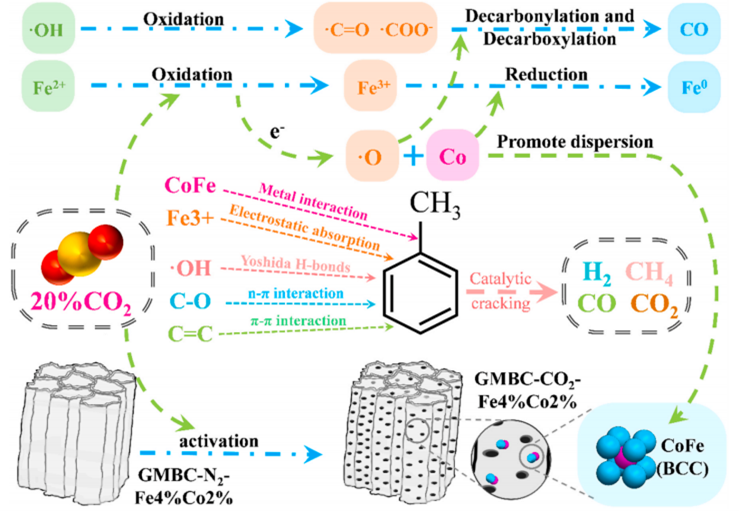 在Journal of Analytical and Applied Pyrolysis上发表的“Synthesis of iron-cobalt-loaded biochar catalyst using CO2-activated goat manure for the enhanced catalytic cracking of toluene”(点击阅读),硕士研究生王鑫佳为第一作者,叶超副教授为通讯作者,bat365正版唯一官网为第一单位。研究结果表明,20%的二氧化碳气氛增强了催化剂表面金属物种的电子转移,并创造了更多的Fe3+位点。该研究能够减少催化剂制备的原材料和时间成本,同时利用废物去除焦油化合物,减轻了动物糞便和焦油造成的环境污染。
