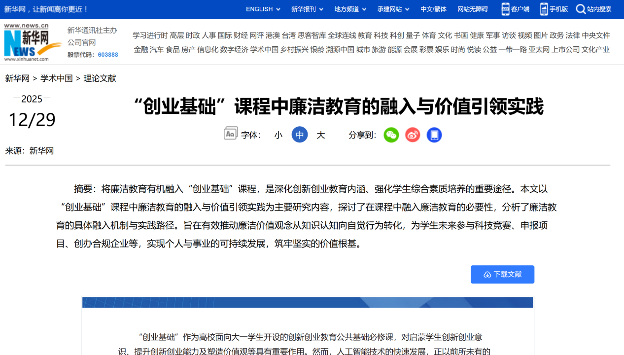 12月29日,新华网学术中国版刊发了由bat365创新创业学院孙方红、陈岁繁撰写的《“创业基础”课程中廉洁教育的植入与价值引领实践》一文(点击阅读)。