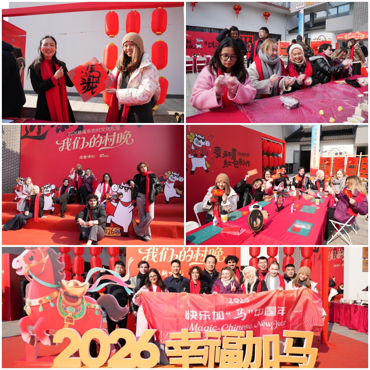 走出音乐厅,传统的中国年味同样生动可触。剪纸、麦秆画等非遗技艺展示区吸引众人驻足尝试;年糕饺、豆酥糖等地方小吃让人品味到“舌尖上的慈溪”;翰墨飘香的书法体验现场,不少同学提笔挥墨,在横竖撇捺间感受汉字书写之美。一场演出、一方集市,共同构成了一幅立体而生动的中国年文化图景。