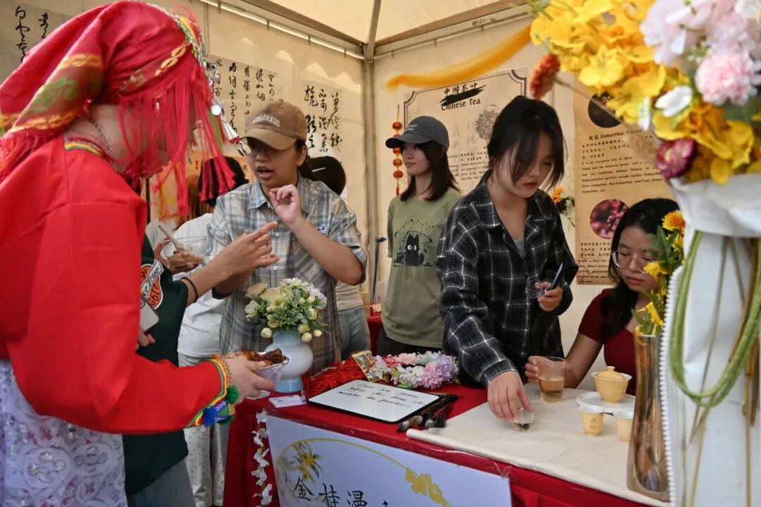 开幕式结束后,30个各具特色的国家文化帐篷同时开放,瞬间将校园变成了“世界文化博览园”。从泰式手标奶茶的醇香,到非洲鼓点的激昂节奏,再到中亚蓝瓷的精美工艺,师生们穿梭于各个展位之间,通过品尝特色美食、体验传统手工艺、试穿民族服饰等互动方式,深度感受世界多元文化的独特魅力。
